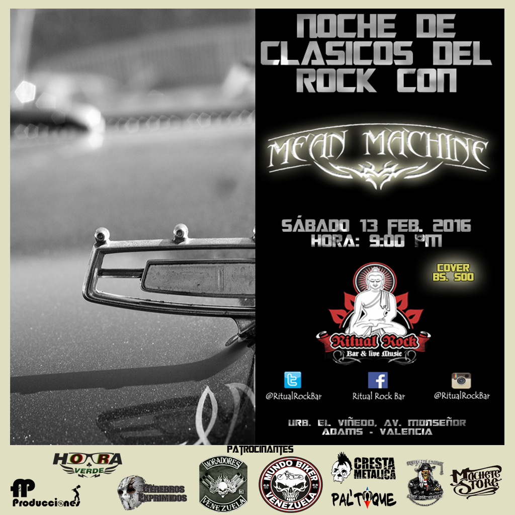 Después de una extensa gira de presentaciones por todo el país en el año 2015, la agrupación Mean Machine regresa a la ciudad de Valencia el día Sábado, 13 de Febrero a Ritual Rock Bar (antiguo Teatro Bar) donde brindara a su público, lo mejor de los clásicos del rock desde los 60’s hasta la actualidad en inglés y español.